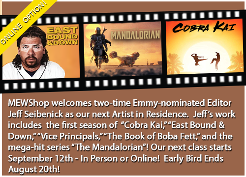 The next installment of MEWShop’s Six Week Intensive Workshop will be taught LIVE online and in person beginning on September 12, 2022. Class runs Monday through Friday from 10 AM ET to 6 PM ET. For more information on the Six Week Intensive Workshop or to register, please visit https://www.mewshop.com/6-week-overview. If you are interested in taking the class online please visit https://www.mewshop.com/six-week-intensive-online for all information and requirements. “We are pleased to announce “The Mandalorian” Editor Jeff Seibenick as our next Artist in Residence,” says MEWShop Director of Education Janet Dalton. “Jeff’ is a testament to building relationships in the editing room and putting in the hard work to fulfilling your dreams in this industry. We are super excited for our students to hear his journey and expertise in this upcoming class!” MEWShop’s early bird pricing ends August 20th.